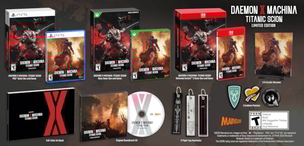 Daemon X Machina: Titanic Scion is available for physical pre-order through the Marvelous USA Online Store and participating retailers in a standard physical edition for an MSRP of $69.99 with the full game on the physical disc or cartridge, and a physical Limited Edition including a copy of Daemon X Machina: Titanic Scion, an original soundtrack CD with 15 tracks, an art book, a set of three flight tags, a set of three patches, and an acrylic standee for an MSRP of $99.99. The title will be published in Asia by Marvelous Inc. and in Europe by Marvelous Europe. This title is rated “T for Teen” by the ESRB.